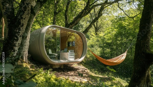 cabin, wood, forest, green, tree, tree, leaf, foliage, nature, hammock, relaxation, peaceful, tranquil, serene, retreat, get-away, secluded, cosy, modern, architecture, design, window, glasses, chair, desk, office, work, home, shelter