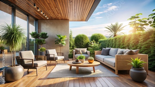 Modern Design House Terrace with Outdoor Furniture and Plants