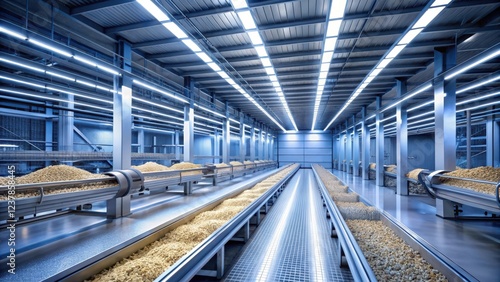 Modern Food Processing Facility Rows of Conveyors Transporting Agricultural Products Through a Clean and Efficient Industrial Setting