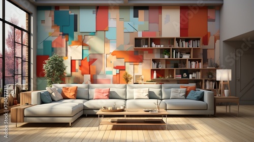 living room, interior design, modern, colourful, abstract painting, sofa, coffee table, bookshelf, wood, plant, window, natural light, home, decor, style, furniture, minimalism, geometric, shape, colours, vibrant, energy, fun, playful, creative, unique, interesting, eye-catching