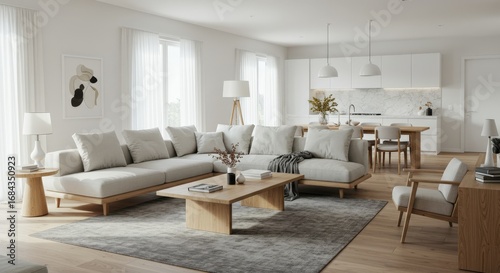 living room, interior, design, modern, minimalist, sofa, couch, cushion, pillow, wooden, coffee table, rug, neutral, white, light, bright, airy, kitchen, chair, decor, home, house, apartment, contemporary, style, elegant, clean, comfortable, cosy, natural light, window, curtain, artwork, vase, plant, book, lamp, furniture, architecture, lifestyle, calm, peaceful, serene, aesthetic, space