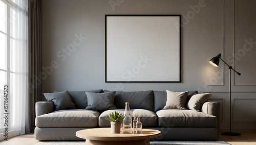 Modern living room with large gray sofa blank picture frame and floor lamp