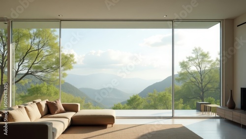 design, empty, couch, comfortable, interior, calm, house, window, elegant, glasses, wood, contemporary, roomy, bright, simple, peaceful, furniture, beige, home, landscape, minimalist, light, view, modern, relaxing, decor, natural, tree, nature, living, mountain, sofa, zen, large, room
