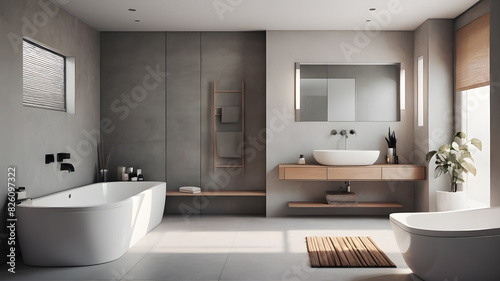 grey, concrete, contemporary, style, home, shower, plant, beautiful, empty, indoor, light, white, bathtub, apartment, wall, window, luxury, room, floor, minimalist, design, modern, interior, mirror, rendering, sink, bathroom, towel, furniture, three-dimensional, beige, washbasin, bathe, illustration, wooden, stylish, clean, faucet, architecture, elegant, render, hotel, house