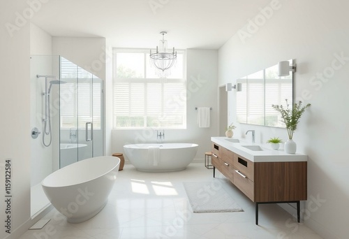 blues, design, modern, contemporary, elegant, cream, vanity, minimalist, relaxing, harmonious, separate, neutral, tub, calming, freestanding, double, realistic, bathroom, visual, style, attractive, sink, aesthetic, soft, white, appealing, simple, interior, space, shower, luxurious, clean