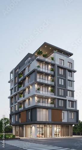 architecture, building, modern, exterior, facades, urban, design, residential, apartment, balcony, structure, construction, contemporary, city, real, estate, home, property, development, elevation, housing, style, outdoors, sky, daylight, grey, white, glasses, window, rooftop, garden, plant, tree, street, perspective, view, corner, concrete, geometric, line, symmetry, commercial, space, awning, shadow, light, rendering, visualisation