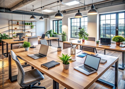 Modern office space with two empty desks, laptops, and notepads, surrounded by professional equipment and tools, conveying a sense of collaborative learning environment.