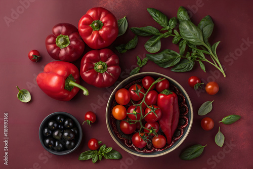 Modern photography composition with red vegetables and green spices. Fresh ingredients ready for cooking. Flat lay view from above. Bell pepper, cherry tomatoes, basil