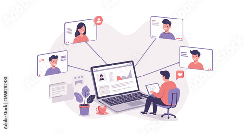 communication, connection, online, virtual, meeting, business, conference, call, presentation, team, teamwork, collaboration, network, cyberspace, technology, digital, device, laptop, computer, screen, office, workspace, workplace, modern, professional, corporate, job, work, employee, employer, manager, leader, success, strategy, planning, innovation, creativity, design, happy, cheerful