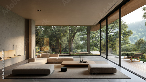 Modern villa with a spacious living room featuring large windows for natural light. --ar 16:9 --v 6.1 Job ID: 21e3428a-03cb-46b1-a663-7ecc95e32196