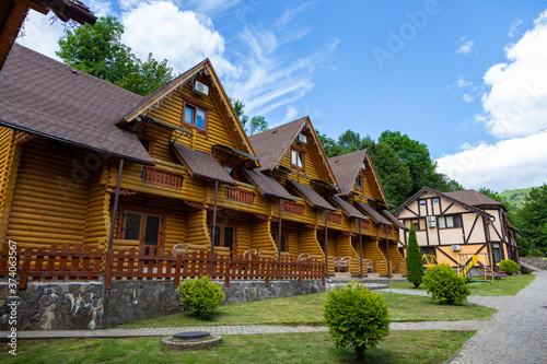 Modern wooden houses from a felling on a background of mountains. Wooden houses with landscaped area on a background of mountains. Traditional wooden cottages at sunny day.
