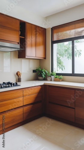 kitchen, modern, wooden, cabinetry, corner, design, plant, sunlight, window, home, interior, interior design, cooking, space, light, natural, minimalist, contemporary, style, room, house, apartment