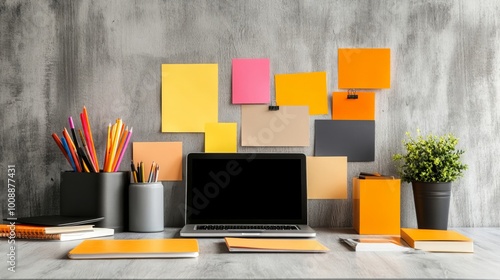 Modern Workspace with Laptop Notebooks and Sticky Notes