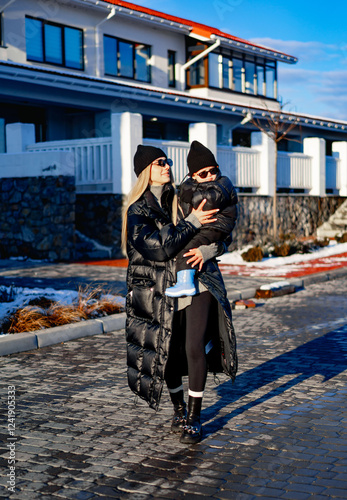 Mom and child winter walk. A mom in a long black coat walks with her baby in a winter setting, enjoying the sunny weather by beautiful buildings.