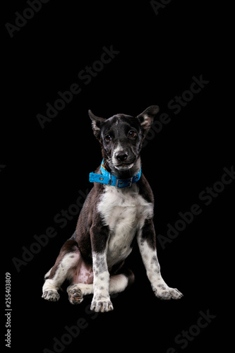 white, blue, background, sitting, cute, animal, dark, doggy, pet, canino, dog, adorable, spot, spotted, dog, paw, fauna, collar, mongrel, copy space, studio shot