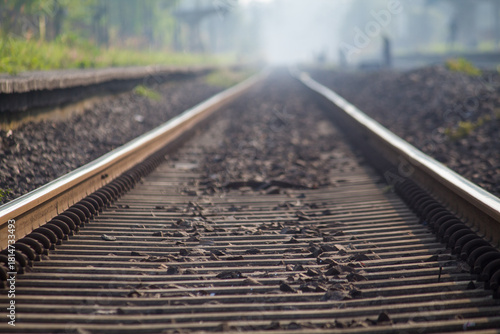 Morning view of a train moving along railway tracks, captured with soft mist and natural light at a quiet rural station.