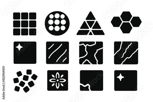 Mosaic Tile Icons. Solid style icons of Mosaic Tiles: square tile, round tile, triangular tile, hexagonal tile, glass tile,