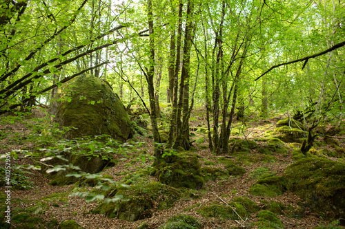 Moss covered rocks and trees in the forest Huelgoat in Finistere, Britanny, France. Forest like fairly tails.