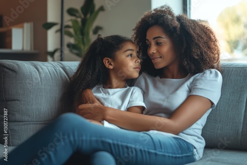 mother, daughter, family, love, hug, hugs, affection, bonding, togetherness, home, living room, sofa, couch, comfort, relaxation, happy, cheerful, smiling, connection, human relationships, parenting, childhood, african american, black, ethnicity, lifestyle, domestic life, indoor, day, natural light, casual attire, authentic, real people, candid