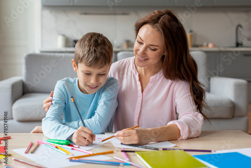 european, family, love, affection, relationship, home, art, mother, son, bonding, happiness, drawing, creativity, interaction, art supply, marker, paper, casual clothes, eye contact, kitchen, conversation, quality time, togetherness, childhood, parenting, care, table, wooden, chair, comfort, lifestyle, hobby, artistic, cheerful, indoor, enjoyment, communication, bright, learning, modern, sharpened, connection, expression, parenthood