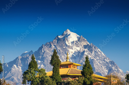 Mount Pandim, 6691 mtrs, 21952 feet high, one of the highest peaks of Himalayan Mountain range - with top of Rinchenpong Monastery in foreground, clear blue sky above. Rinchenpong, Sikkim, India