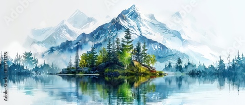 mountain with trees and water, watercolor painting, white background