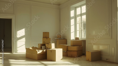 Moving boxes in a new house. Concept of moving to a new house. Generative AI