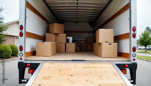 Moving truck with boxes for residential relocation with copy space for moving day; transitioning home