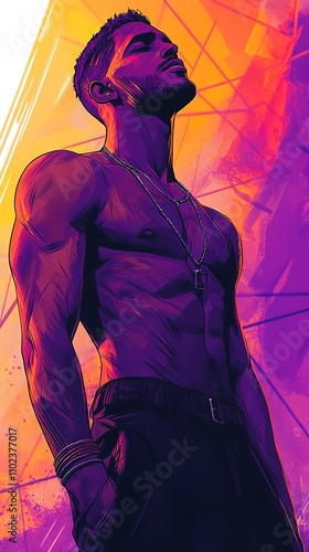 muscular, figure, pose, digital, artwork, abstract, background, vibrant, colours, strength, confidence, expression, purple, orange, fitness, athleticism, body, positivity, character, design, empowerment, bold, stylised, modern, art, tropical, fashion, pride, cool, energy, uniqueness, boldness, creative, inspiration, human, form, posture, stylish, youth, visual, concept, attitude, contemporary, aesthetic, scene, powerful, graphic, illustration, personality
