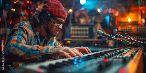 musician, keyboard, studio, recording, music, playing, instrument, earphones, microphone, equipment, man, beanie, red, recording studio, audio, artist, sound, production, technology, creative, composition, performance, musical, instrumental, key, piano, synth, electronic, rythm, melody, harmony, audiophile, sharpened, passion, music lover, dark, colourful, vintage, indoor, professional