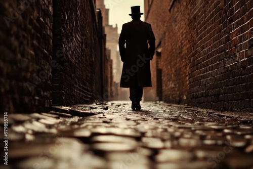 mysterious, silhouette, man, silk hat, walking, dark, narrow, alley, cobbled, street, vintage, eerie, foggy, mist, path, historical, victorian, shadow, urban, architecture, moody, scene, retro, old-fashioned, solitary, dramatic, atmospheric, skittish, night, overcoat, brick, wall, alleyway, hidden, enigma, suspense, detective, thriller, lamp, antique, gloomy