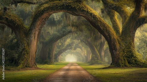 Mystical oak alley, misty dawn, path, southern plantation, nature, serene, background, travel, postcard