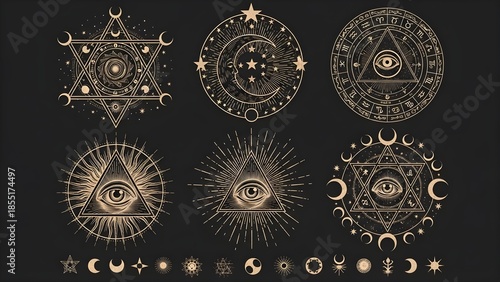 occult, mystical, symbol, esoteric, eye, providence, triangle, moon, star, celestial, magic, spirituality, alchemy, zodiac, divine, secret, geometry, sacred, ancient, vintage, gold, dark, nirvana, mystic, cosmos, universe, signs, emblem, tattoo, wisdom