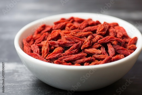 Natural goji berry snack. Bowl of goji berries on a dark surface, showcasing vibrant red color.