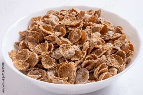 Natural whole grain wheat flakes in white bowl. Healthy breakfast concept. Plate with multigrain flakes on white background