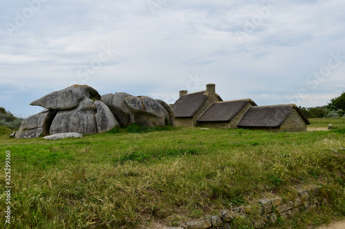 france, brittany, rock, landscape, saint-pierre, grass, nature, ancient, green, blue, cloud, countryside, hill, summer, thatched