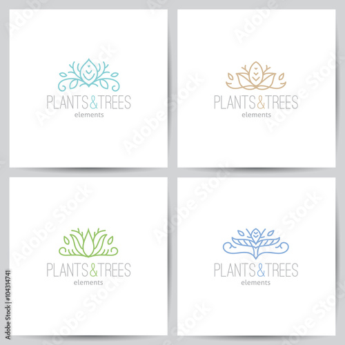 plant, tree, leaf, flower, floral, tree branch, forest, element, design, logotype, emblem, icon, simple, line, contour, set, collection, nature, ecology, eco, bio, creative, trendy, style, corporate, corporative, business, company, white, background, card, template, shadow, paper, page, grey, blue, green, mint, orange, colours, swirl, curl, ornament, ornate
