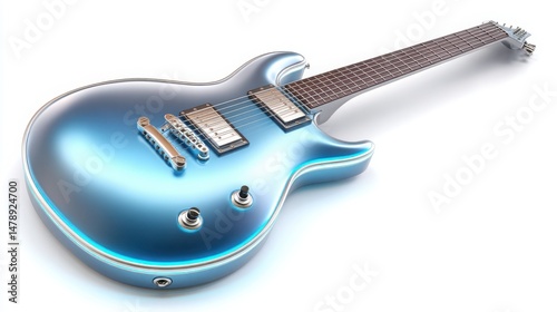 Neon blue electric guitar with chrome strings and polished body, isolated on a bright white background
