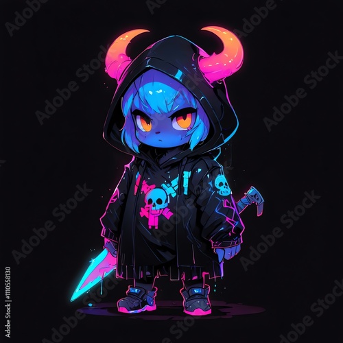 daemon, character, art, digital, illustration, fantasy, neon, blue, pink, purple, black, dark, hooded, girl, skull, horn, knife, stylish, edgy, cute, cool, rebellious, fierce, small, mini, anime, manga, artwork, graphic, design, vibrant, bold, modern, trendy, gothic, gaming