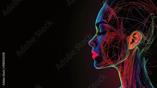 woman, female, profile, face, abstract, art, neon, line, colourful, vibrant, bright, dark, background, black, design, illustration, graphic, modern, style, energy, light, stroke, intricate, detailed, texture, artistic, creative, concept, imagination, fantasy, mystical, mysterious, beauty, elegant, graceful, portrait, silhouette, head, hair, neck, shoulder, eye, lip, nose, ear