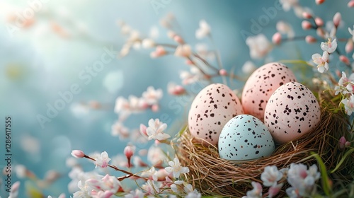 nest, egg, blue, pink, tree branch, tree, easter, spring, holiday, coloured, background, decorated, celebration, food, seasonal, tradition, flower, yellow, beautiful, wooden, springtime, design, wood, april, rustic, green, basket, greeting, festive, card, event, white, nature, happy, symbol, concept, paint, pattern, copy, table, pastel, easter egg, red, nobody, group, space, blossom, tulip, brown