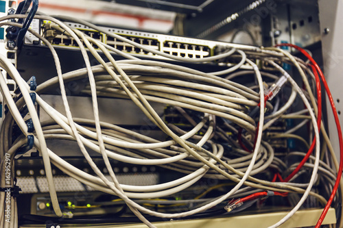 Network cables, hardware, switch of fiber optic hub for digital communications in server room. Electronic computer hardware technology