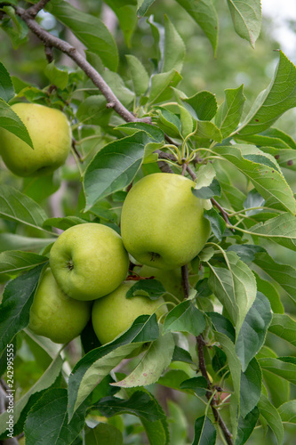New harvest of healthy fruits, ripe sweet green apples growing on apple tree
