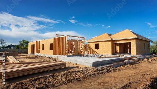 New home development construction site; newly developed subdivision with new construction; brand new suburbs; American home construction site; homes built with wood; new home developers