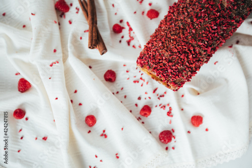 New Kurtos Kalacs, traditional Hungarian food, also known as chimney cake with amazing cinnamon and raspberry flavor on a rustic tablecloth.