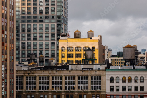 new york city, city, skyline, architecture, building, water tower, skyscraper, historic, modern, urban, landscape, cloudy, sky, window, tower block, downtown, contrast, rooftop, view, metropolis, city landscape, structure, diverse, unique, iconic, tied-up, crowded, dense, metropolitan, bustling, big, famous, scene, residential, office, development, real estate, infrastructure, design, old, new, facades