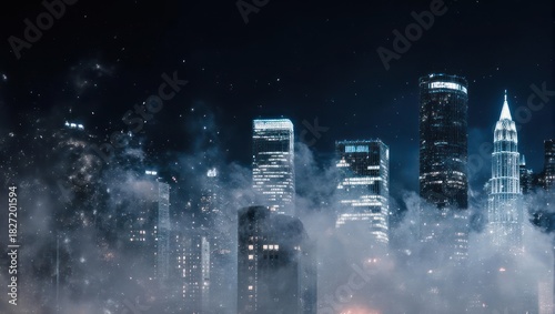 Night cityscape with tall buildings, some partially obscured by a thick, atmospheric fog