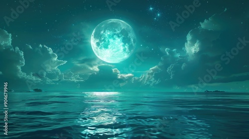moon, night, ocean, water, sky, cloud, full, star, horizon, landscape, seascape, nature, blue, dark, calm, serenity, tranquil, peaceful, dreamy, mystical, magical, astronomy, astrophotography, twilight, night time, deep, green, teal, soft, glowing, aglow, beautiful, high-coloured, dream, imagination, fantasy, artistic, digital, art