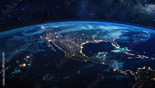 earth, night, space, star, galaxy, cloud, atmosphere, north america, central america, mexico, us, canada, caribbean, light, city, urban, illumination, darkness, planet, globe, celestial, cosmos, universe, satellite, view, perspective, landscape, geographical, continent, ocean, blue, black, dark, bright, light, weather, night time, aerial, orbital, image, photo, photo, curvature, horizon, earth