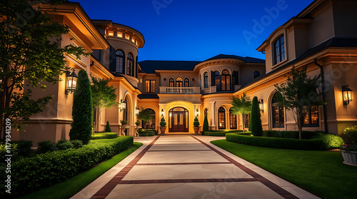 Nighttime View of a Multi-Story Mansion with Landscaped Driveway
